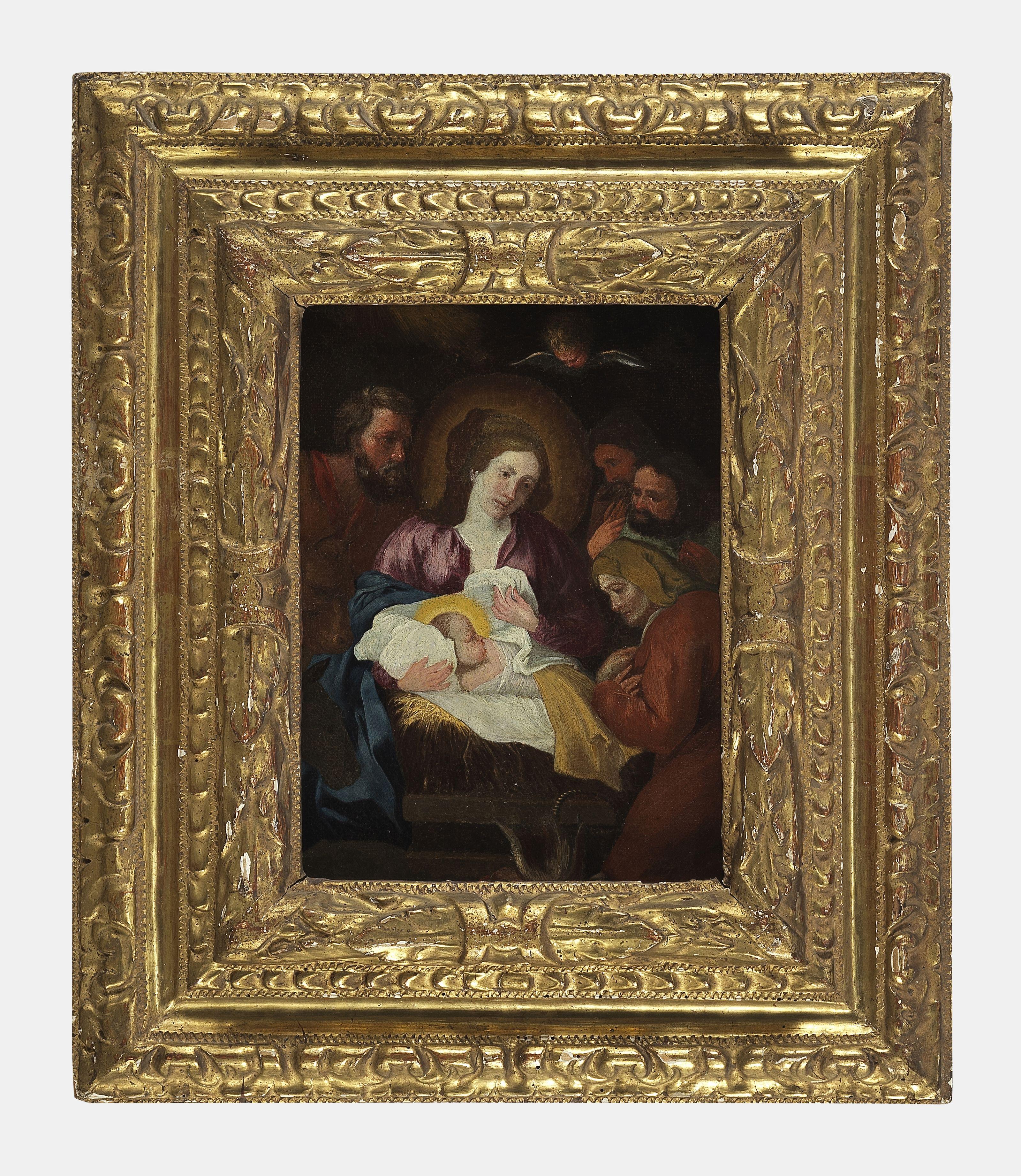 L'adoration des bergers, huile sur toile, 28x21 cm. Cadre en bois sculpté et doré.