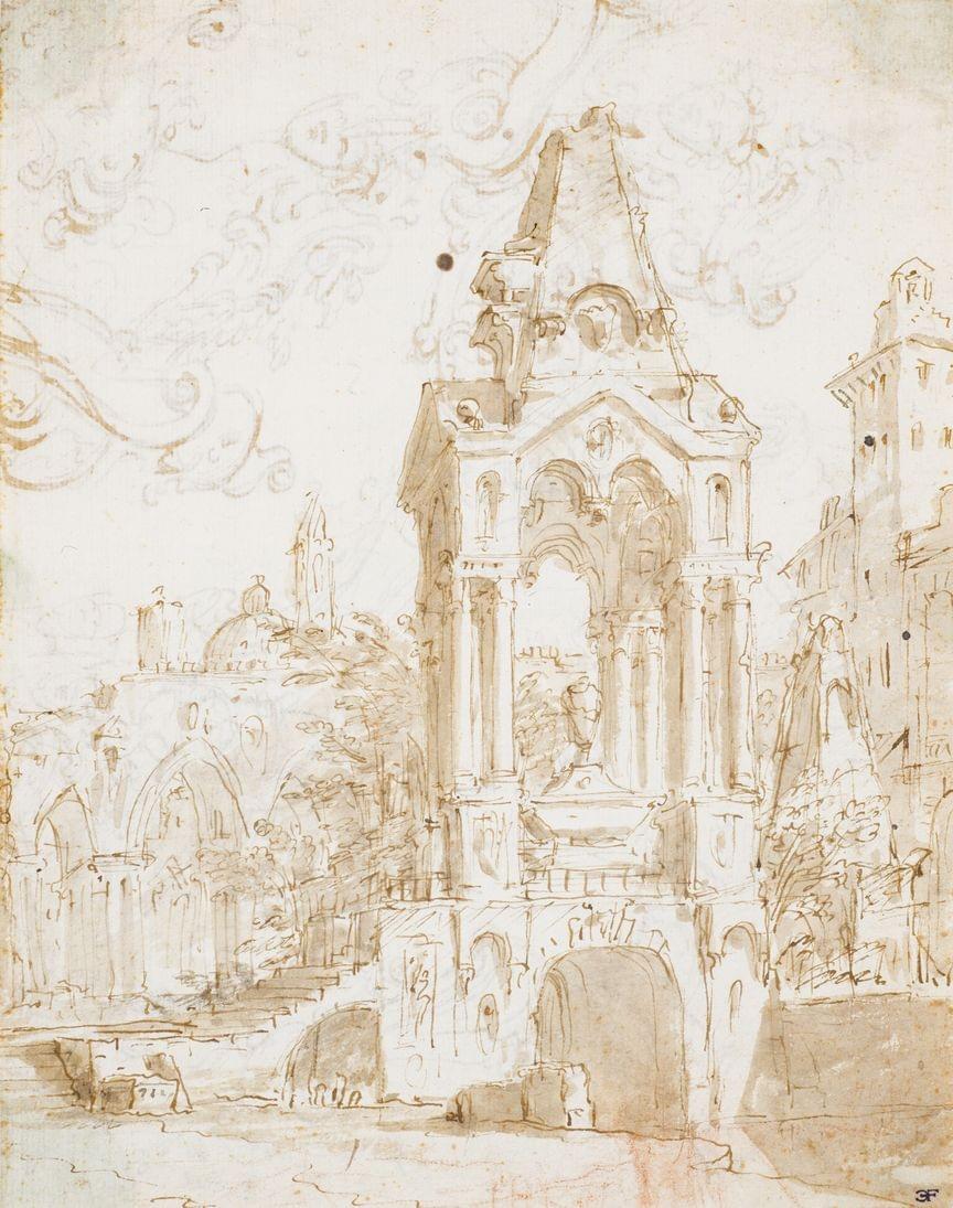Architecture et ruines, suite de quatre encres et lavis d'encre, ancienne collection Edmond Fatio, 19x26, 23x18, 16x12 et 15x10 cm