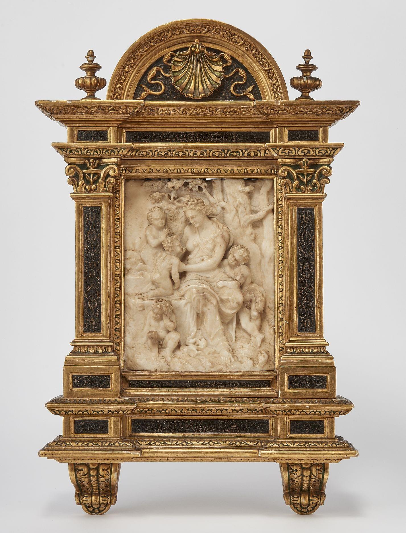 Allégorie de la Charité, albâtre sculpté, cadre de style Renaissance en bois sculpté et doré, 18x14 cm