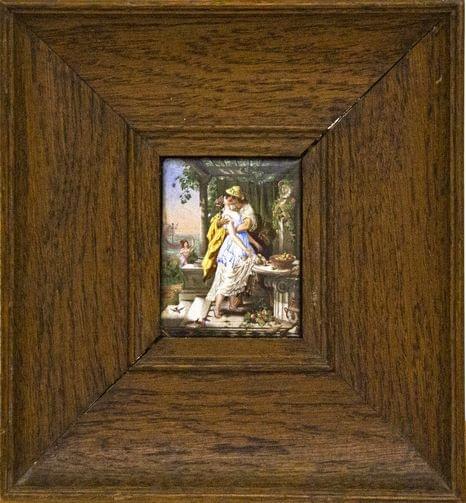 Scène galante au bord de la mer, émail sur cuivre, 8,5x6 cm