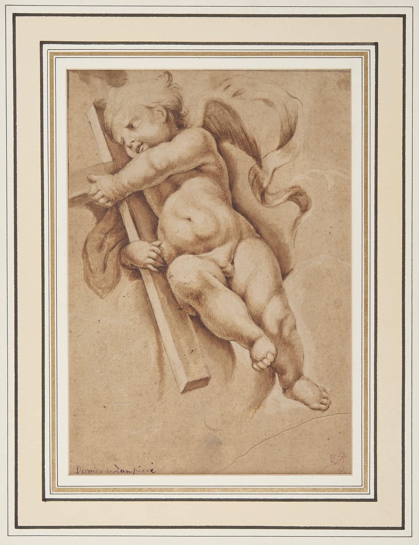 Ange portant une croix, lavis et encre sur papier, porte une signature de Domenico Zampieri, dit Le Dominiquin, 25x18 cm