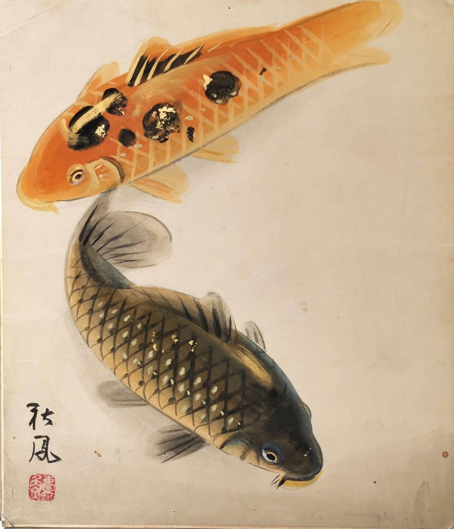 Deux poissons, gouache et encre sur papier, 27x24 cm