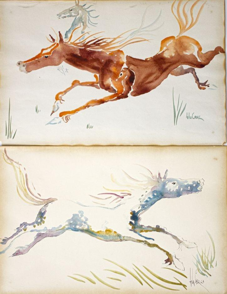 Deux études de chevaux, paire d'aquarelles sur papier, signées La Cruz, 31,5x48 cm