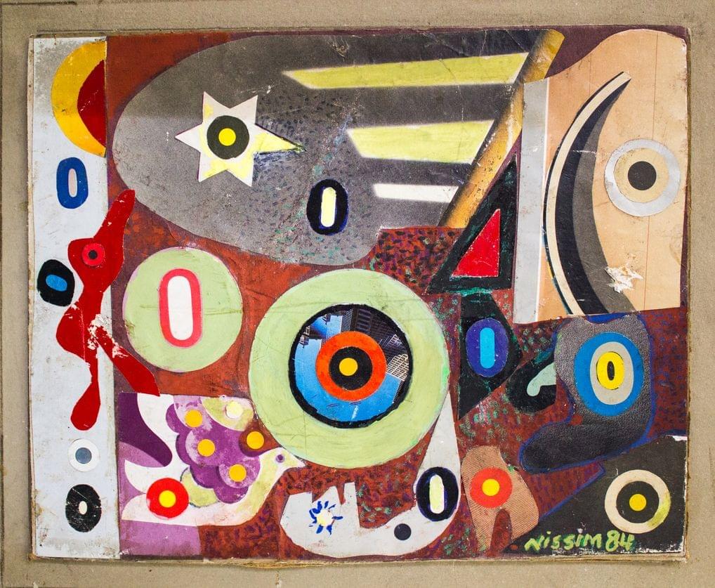 Composition abstraite, collage, signé Nissim et daté 84, 23x29 cm