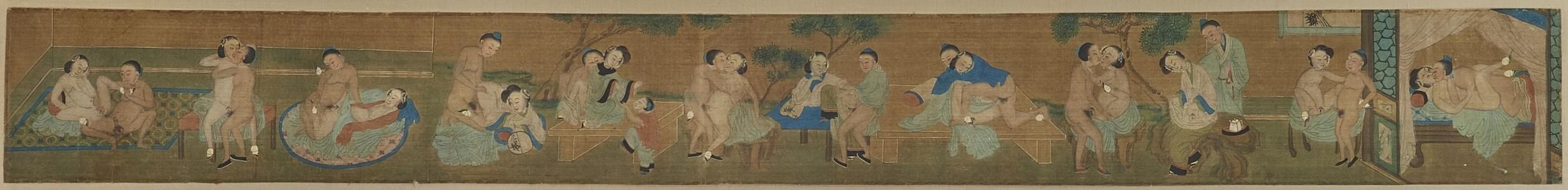 Scènes érotiques, encre et gouache sur soie, 16x132 cm. Provenan...