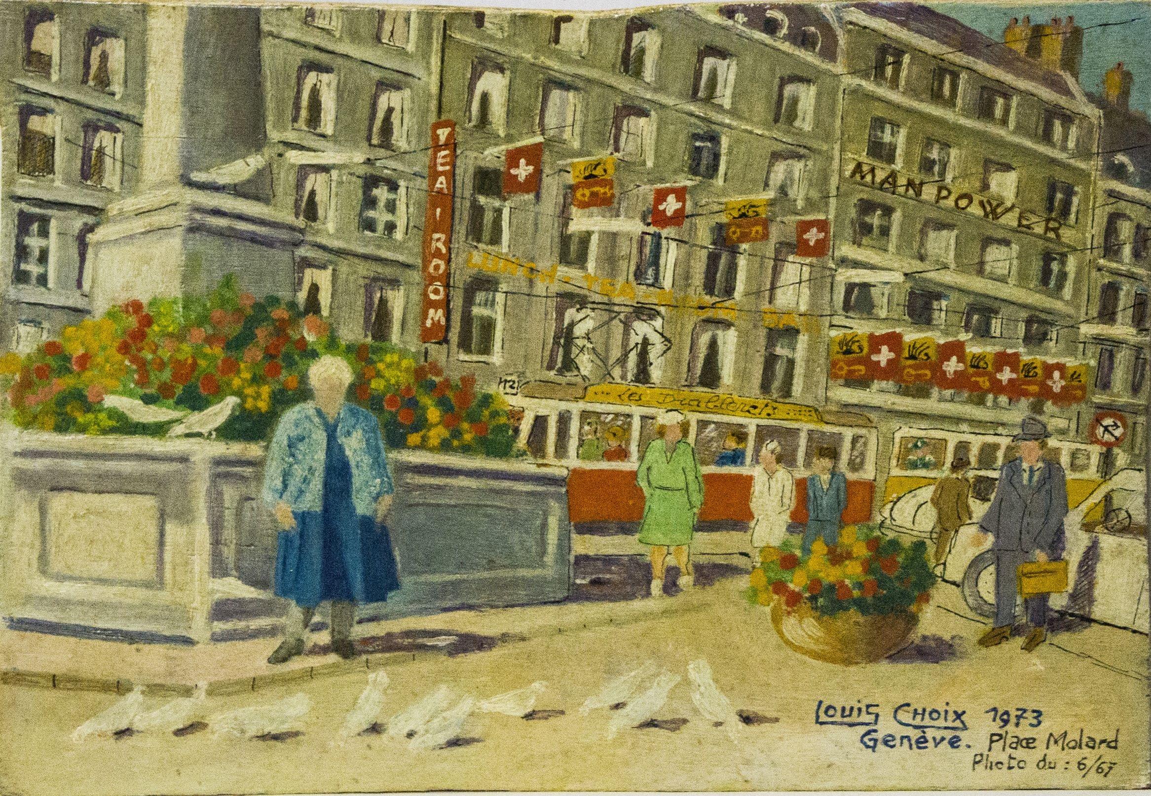 Place du Molard, Genève, huile sur bois, signée et datée 1973, 24x33 cm