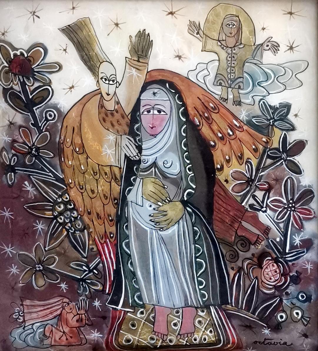 Annunciacion, peinture et dorure sous verre, signée,30x27 cm