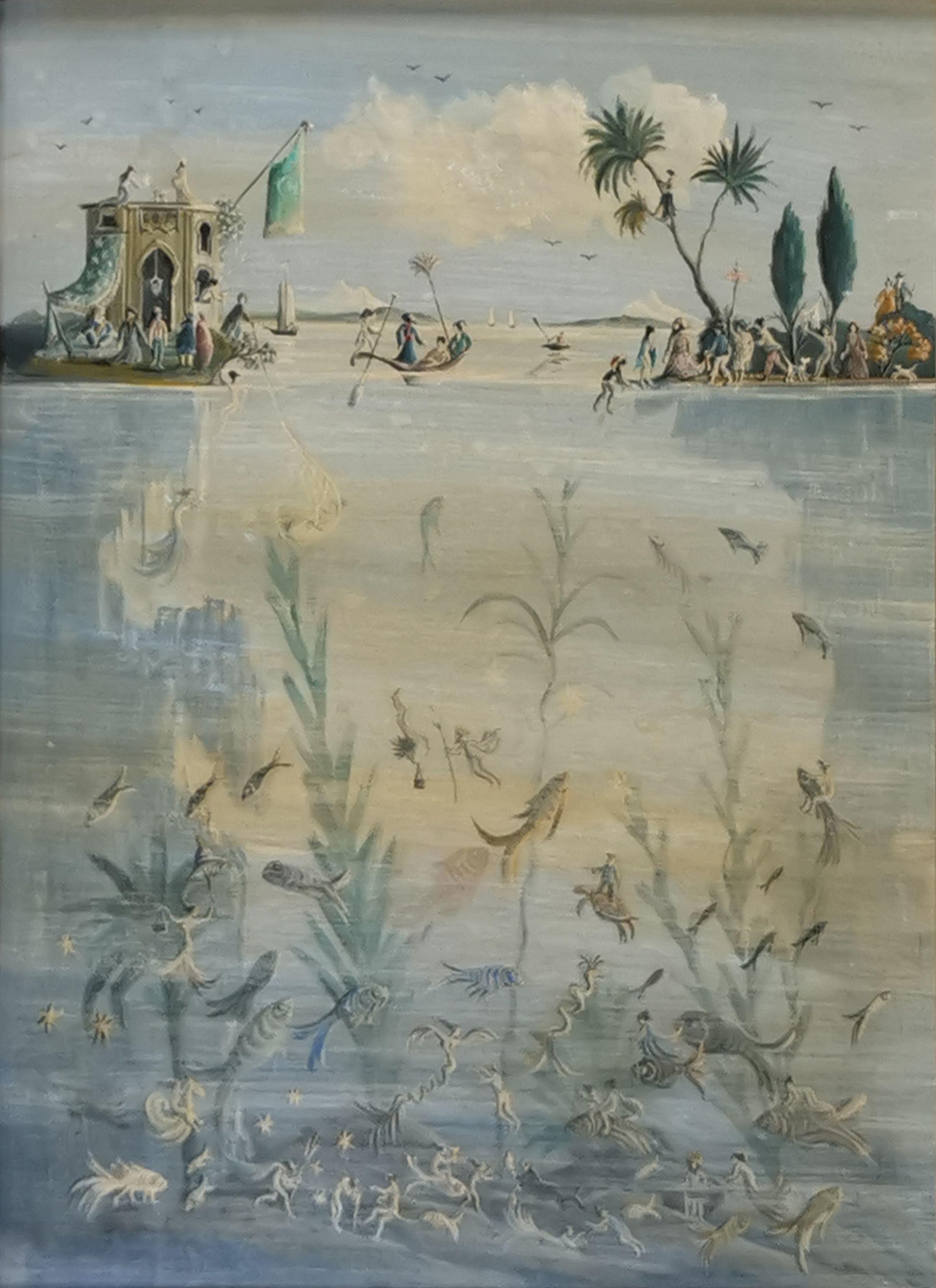 Scène de vie sous-marine, huile sur pavatex, 47x37 cm