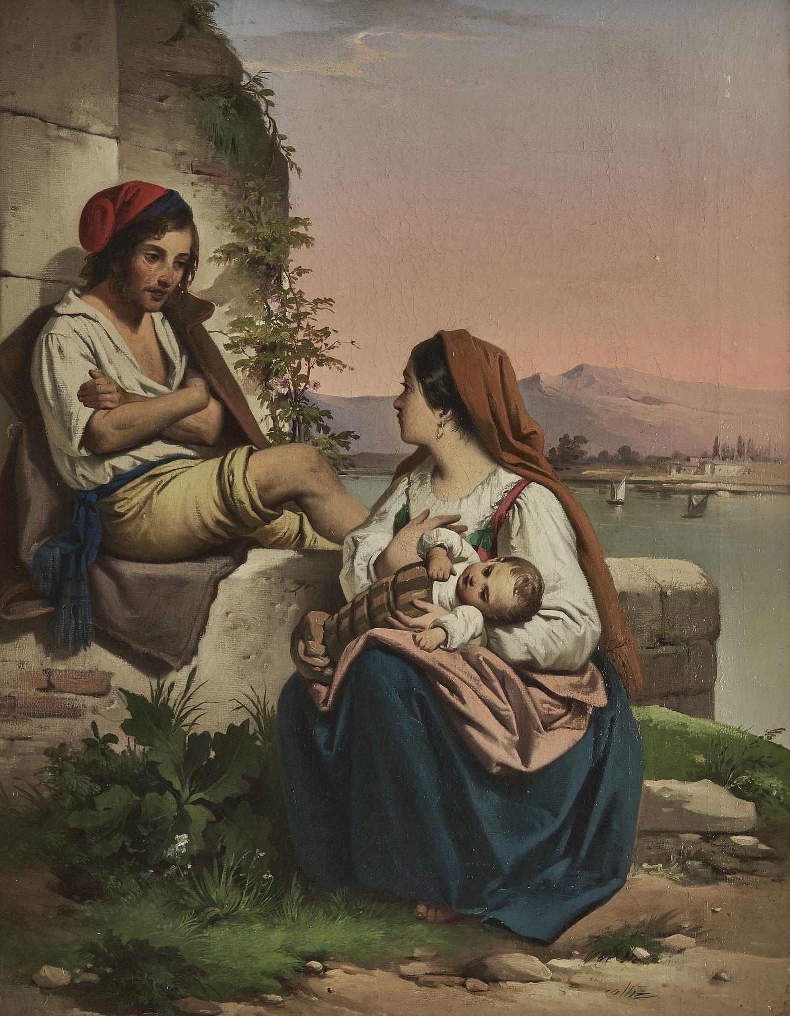 Conversation d'un jeune couple autour d'un enfant, huile sur toile, 60x48 cm