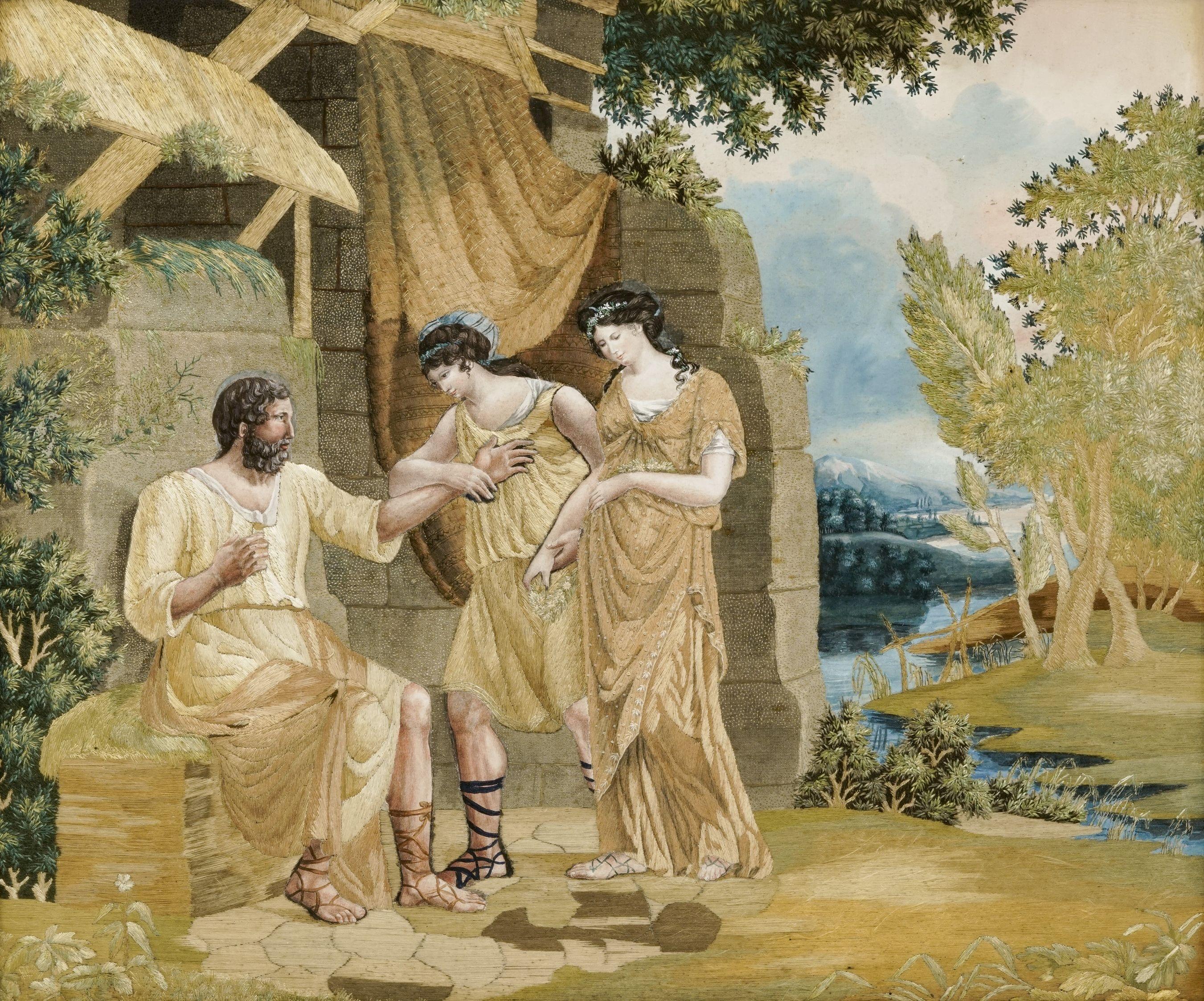 Scène mythologique, broderie et gouache, 48x58 cm