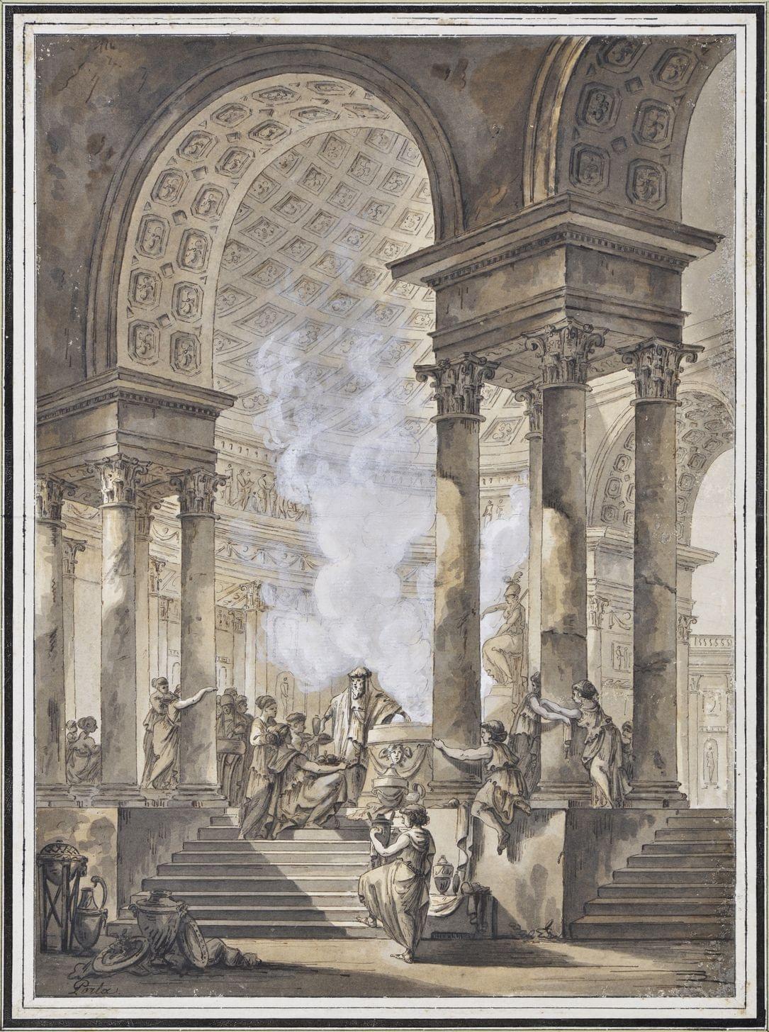 Caprice architectural animé, lavis et gouache blanche sur papier, 35x26 cm