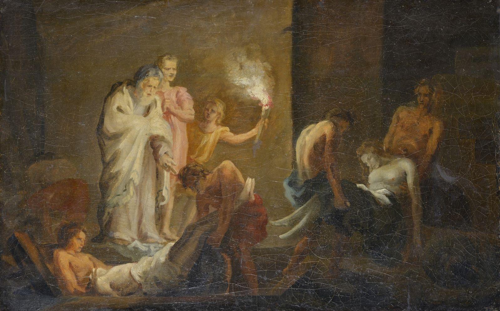 Paysans attablés à l'extérieur, huile sur toile signée F. Jacque...