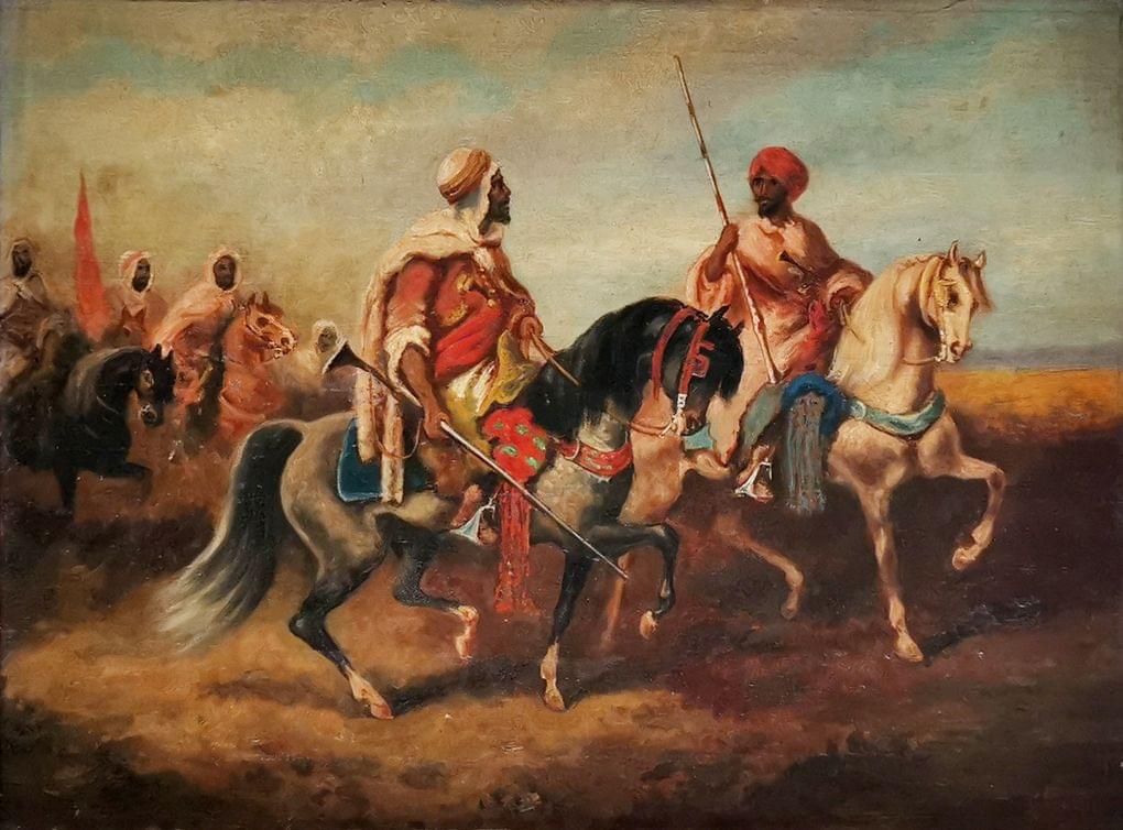 Berbères à cheval, huile sur panneau, signée Martin et datée 14, 30x40 cm