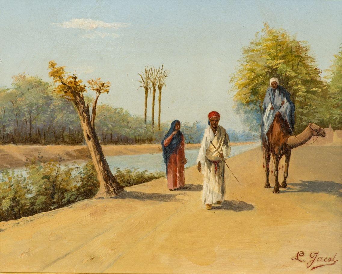 Les bédouins le long du canal, huile sur panneau signée, 21x26cm