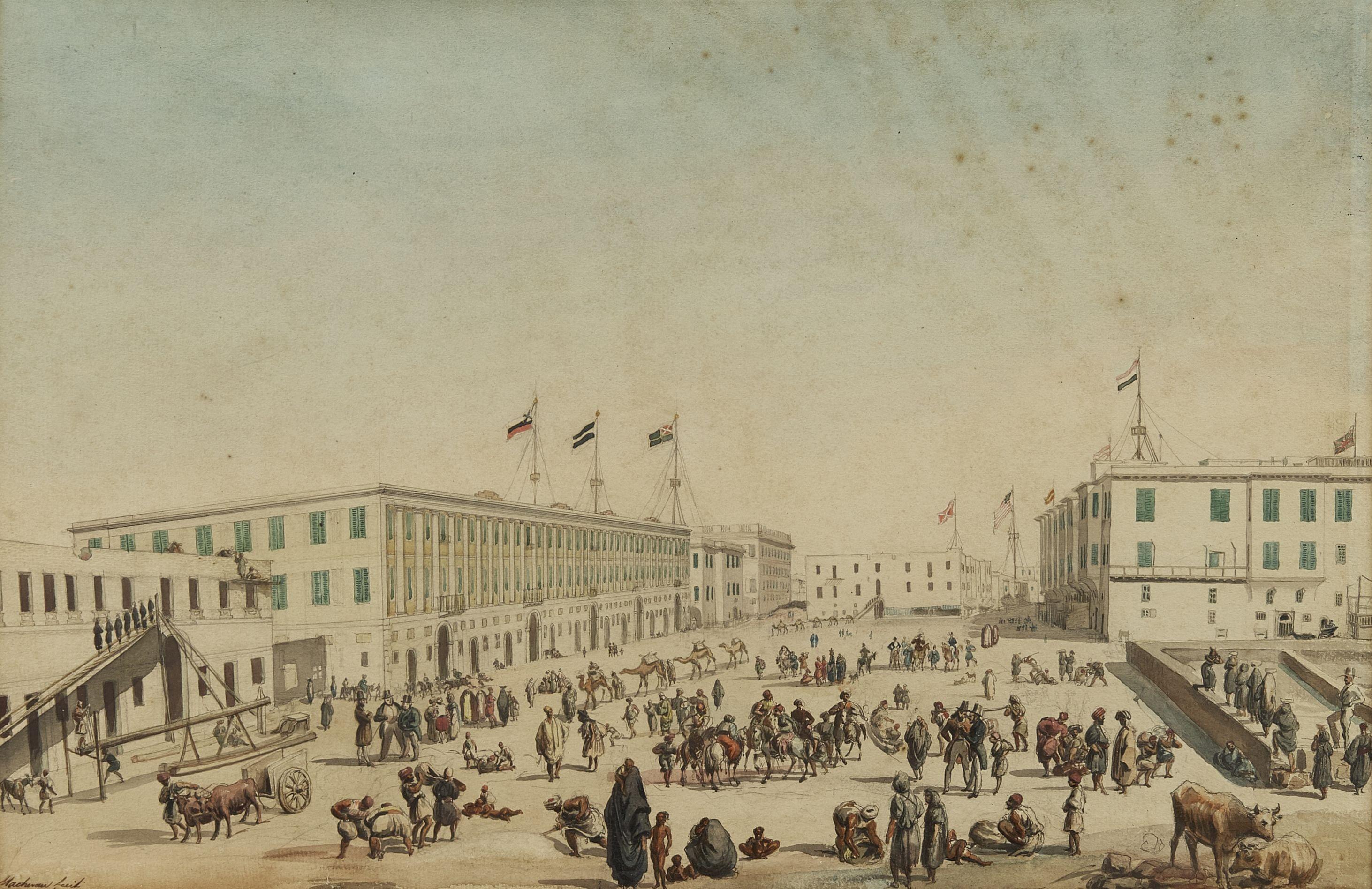 Scène de marché, vue de l'entrée du quartier européen d' Alexandrie, 9 sept 1834, actuellement place Mohamed Ali, encre et aquarelle sur papier, signée Mechevau fecit, 32x50 cm