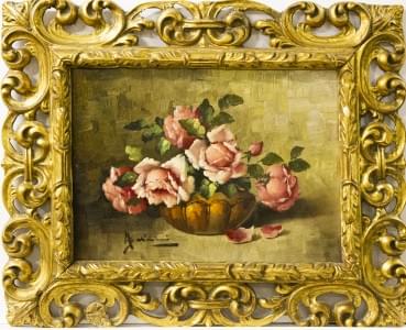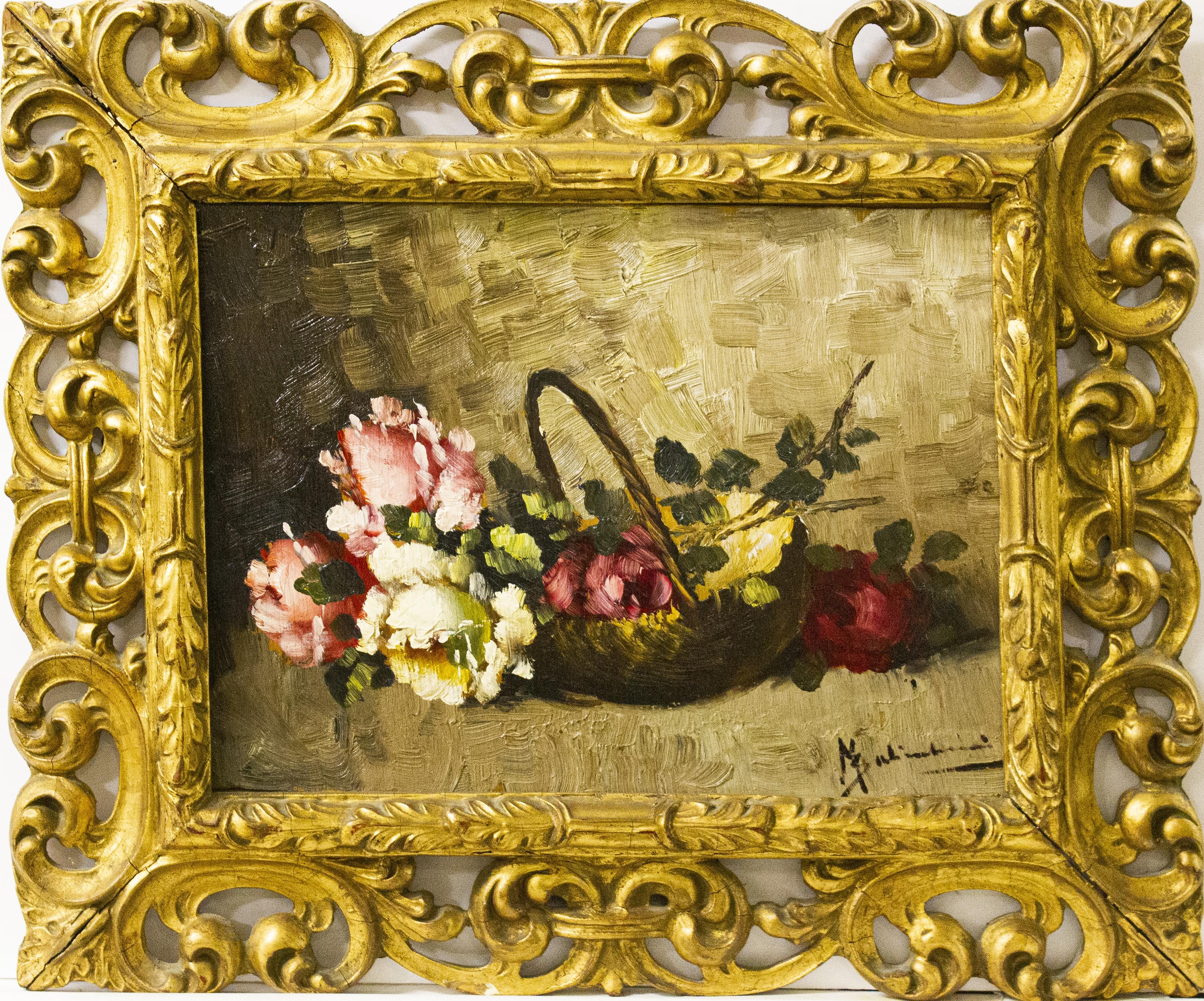 Deux corbeilles fleuries, paire d'huiles sur carton, 28x38 xm
