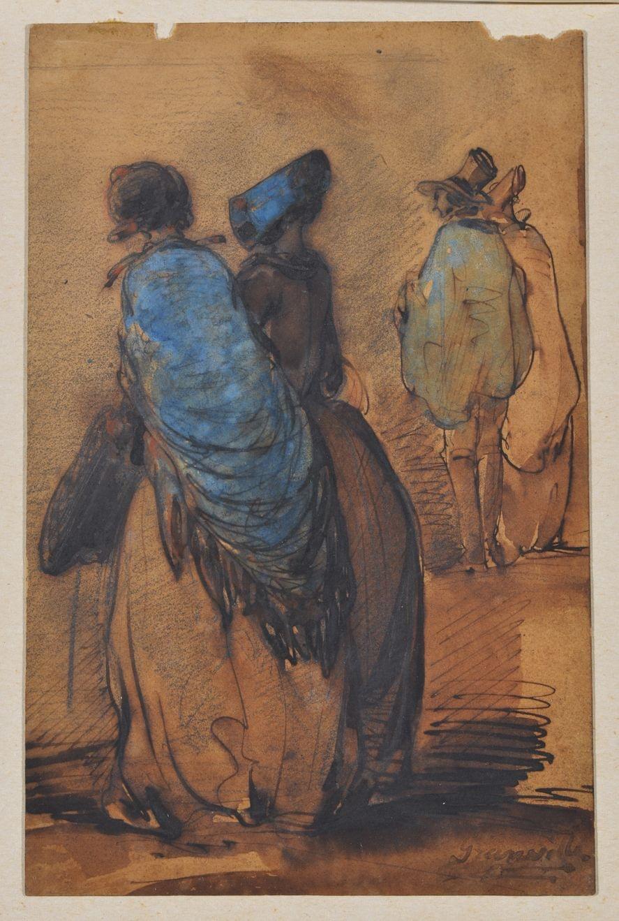 La conversation, encre et aquarelle sur papier, porte une signature de Granville (1803-1847)