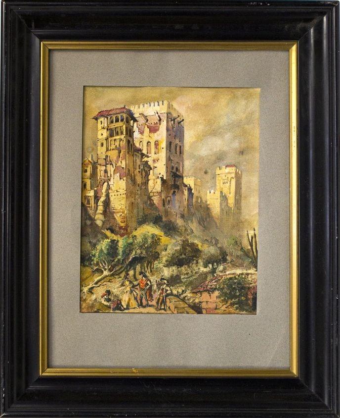 Scène galante devant une cité médiévale, gouache sur papier, 31x24 cm