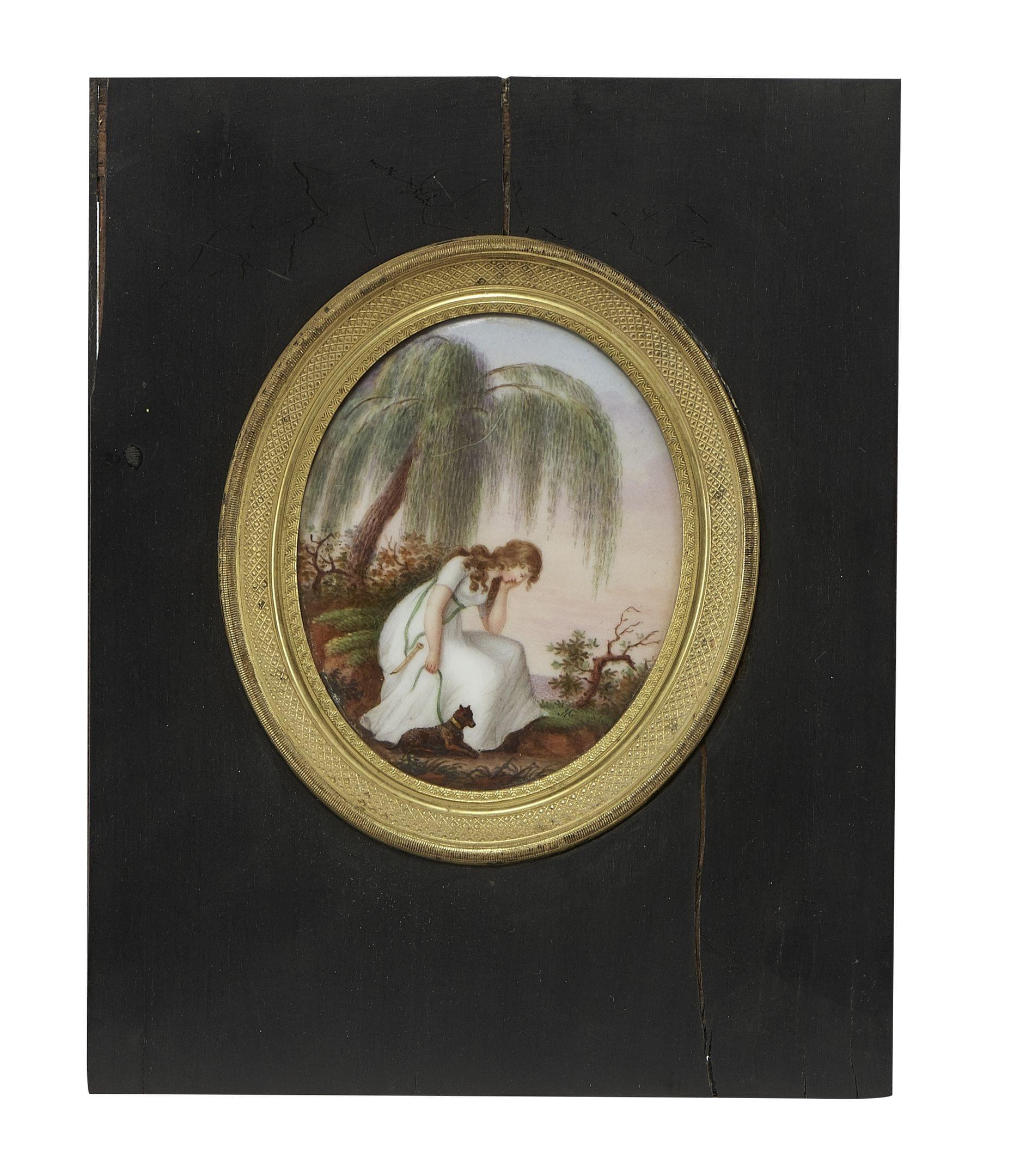 Jeune femme et son chien sous un saule, émail sur porcelaine, monogrammé M, 7,5x6 cm