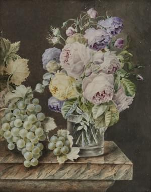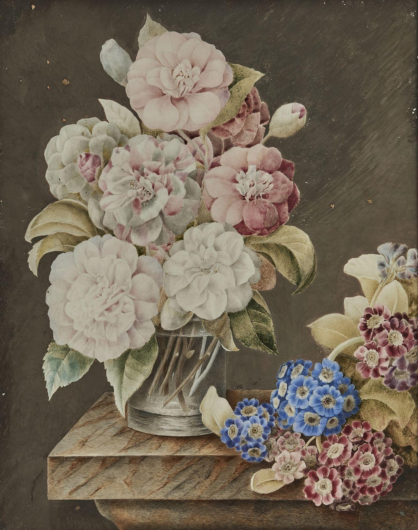 Bouquets de fleurs sur entablement, paire d'aquarelles sur papier, 49x39 cm
