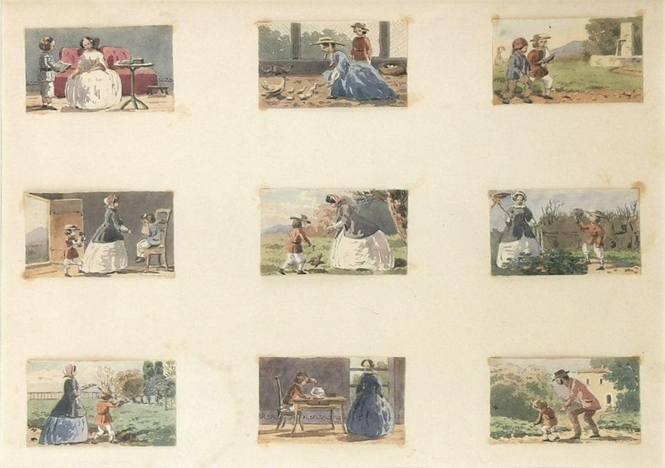 Suite de neuf petites scènes de la vie quotidienne, aquarelle sur papier dans un même encadrement, 4x6 cm chaque