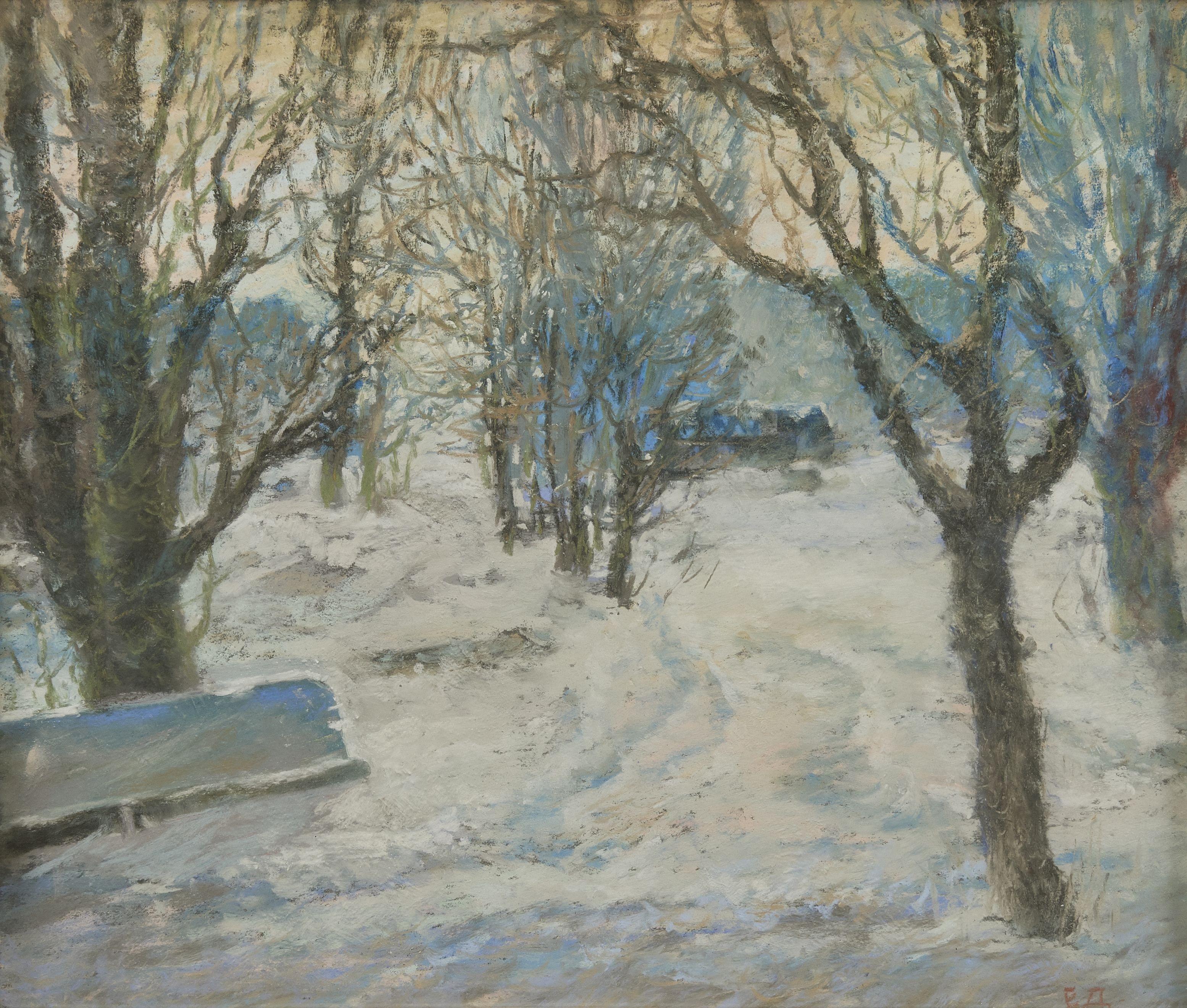 Paysage sous la neige, Russie, pastel sur papier, signée Dekan, 45x54 cm