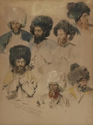 Etudes de cosaques, aquarelle et mine de plomb sur papier, signée, située et datée juillet 1859, 35x27 cm