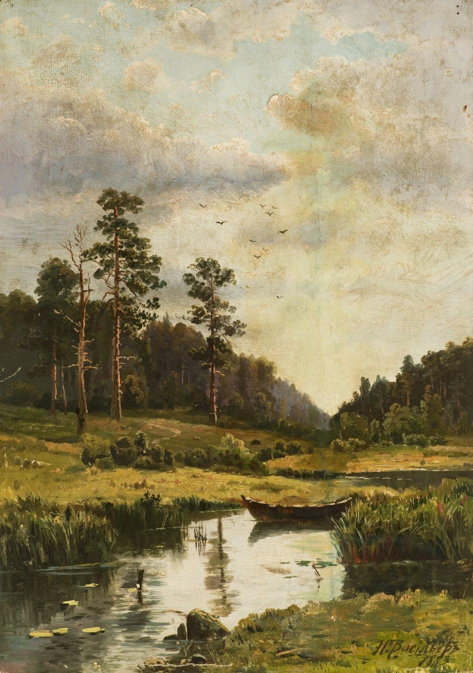 Paysage à la barque, huile sur toile datée 1883, 64x45 cm