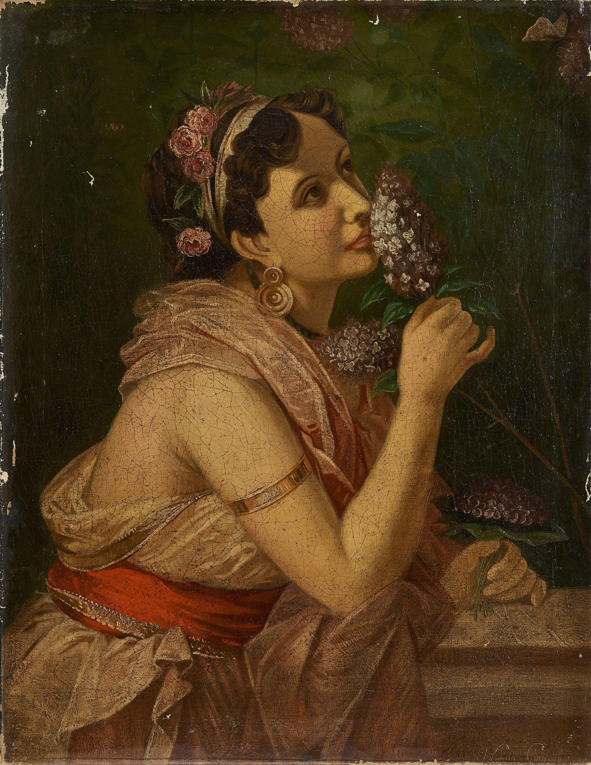 Femme aux lilas, huile sur toile, signature non identifiée, 75x66 cm