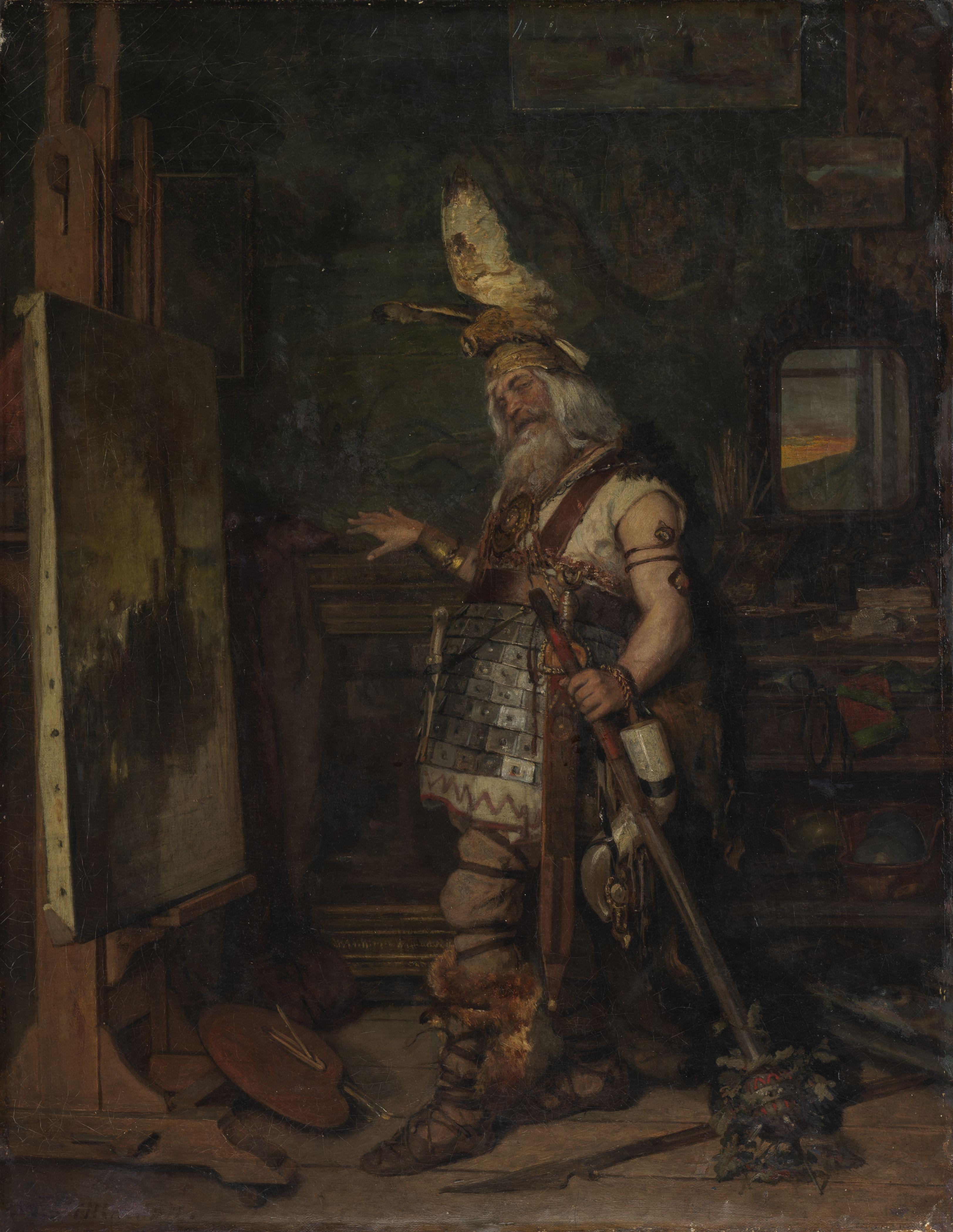 Modèle costumé dans le studio d’un artiste, huile sur toile, signature illisible, 68x50 cm