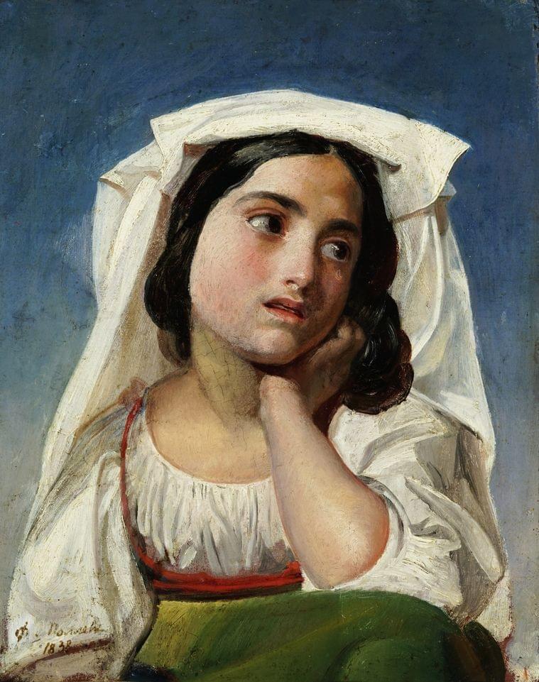 Napolitaine, huile sur toile, signature non identifiée et datée, 1838, 33x26 cm