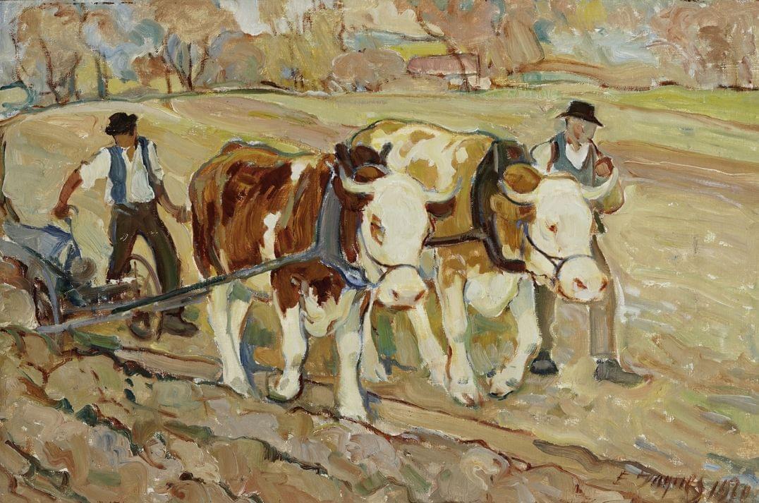 Le travail aux champs, huile sur toile signée E. Jacques et datée 1920, 37,5x56 cm