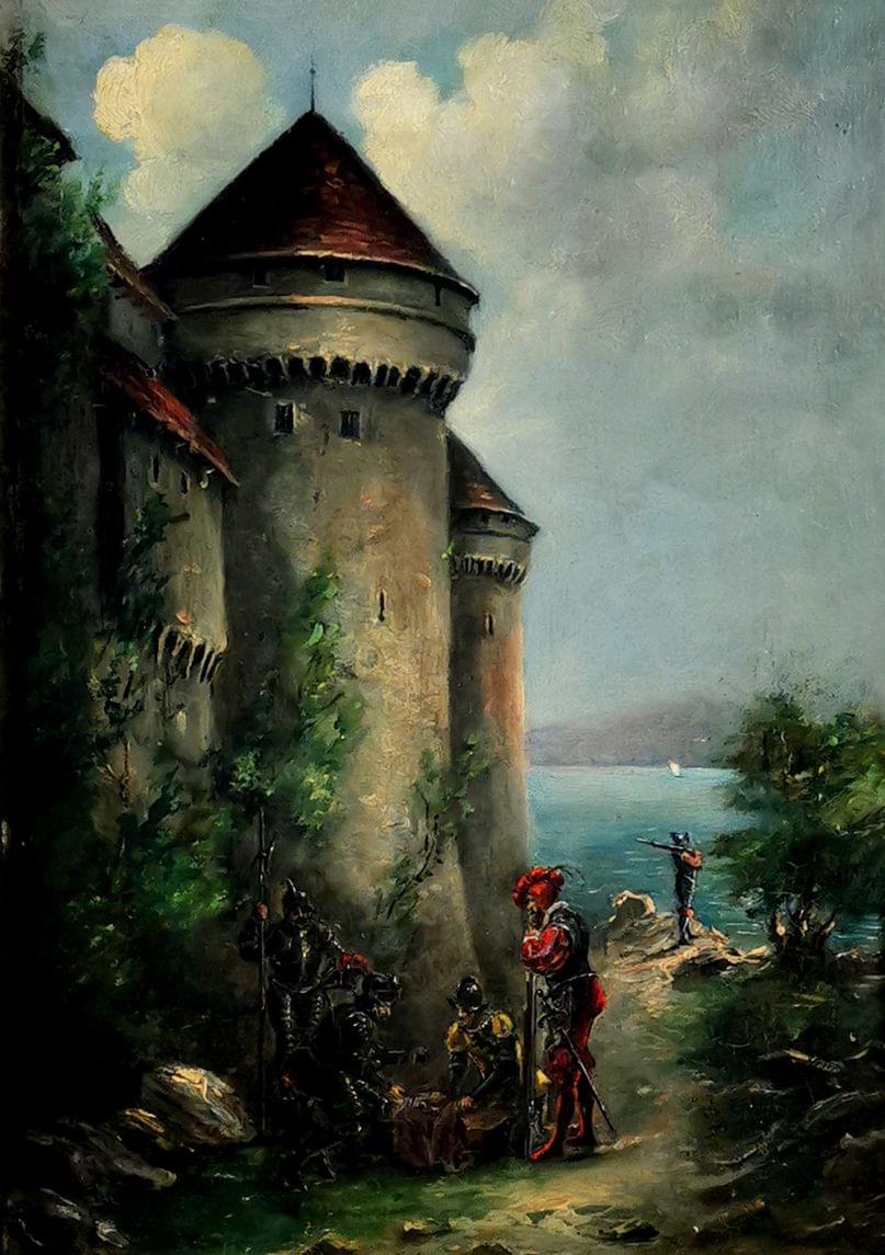Lansquenets jouant aux dés devant un château, huile sur toile, 29,5x20,5 cm