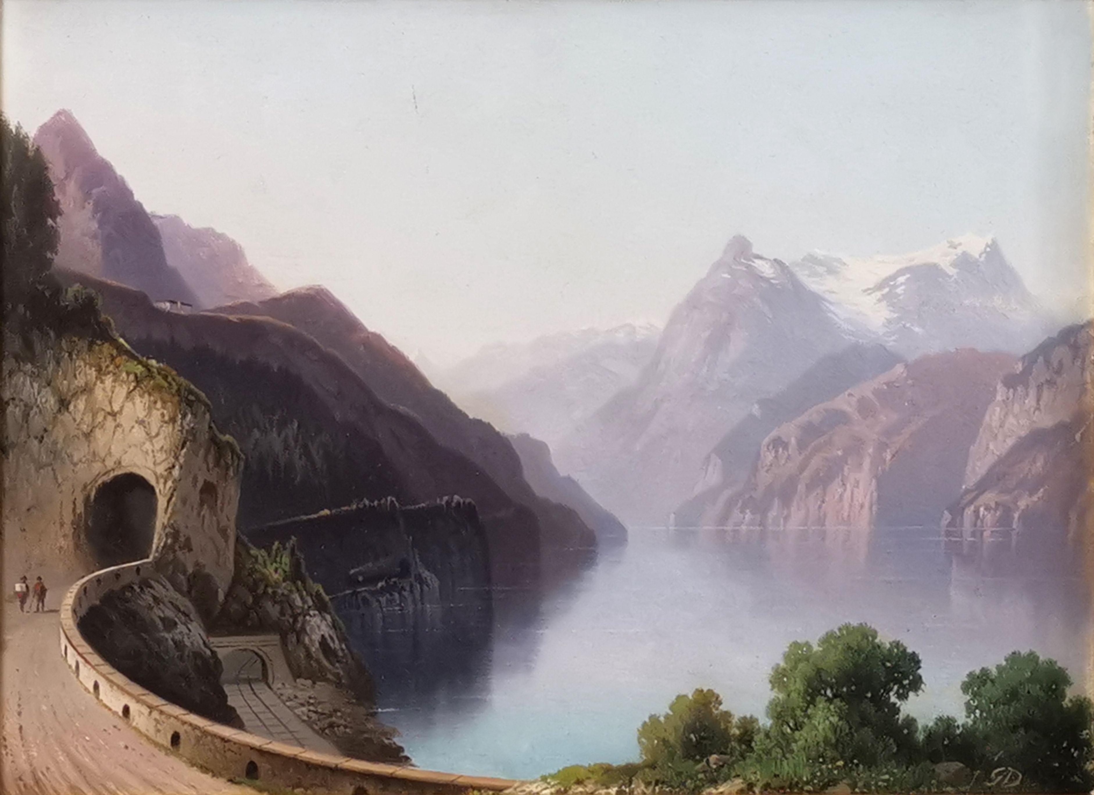 Vue de l'Axenstrasse depuis Brunnen, huile sur panneau, signée GD, 24x32 cm