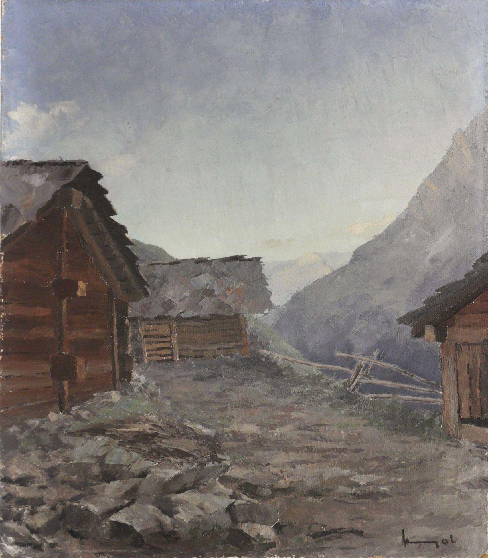 Chalets d'alpage en Valais, huile sur panneau, signée, 46x37 cm