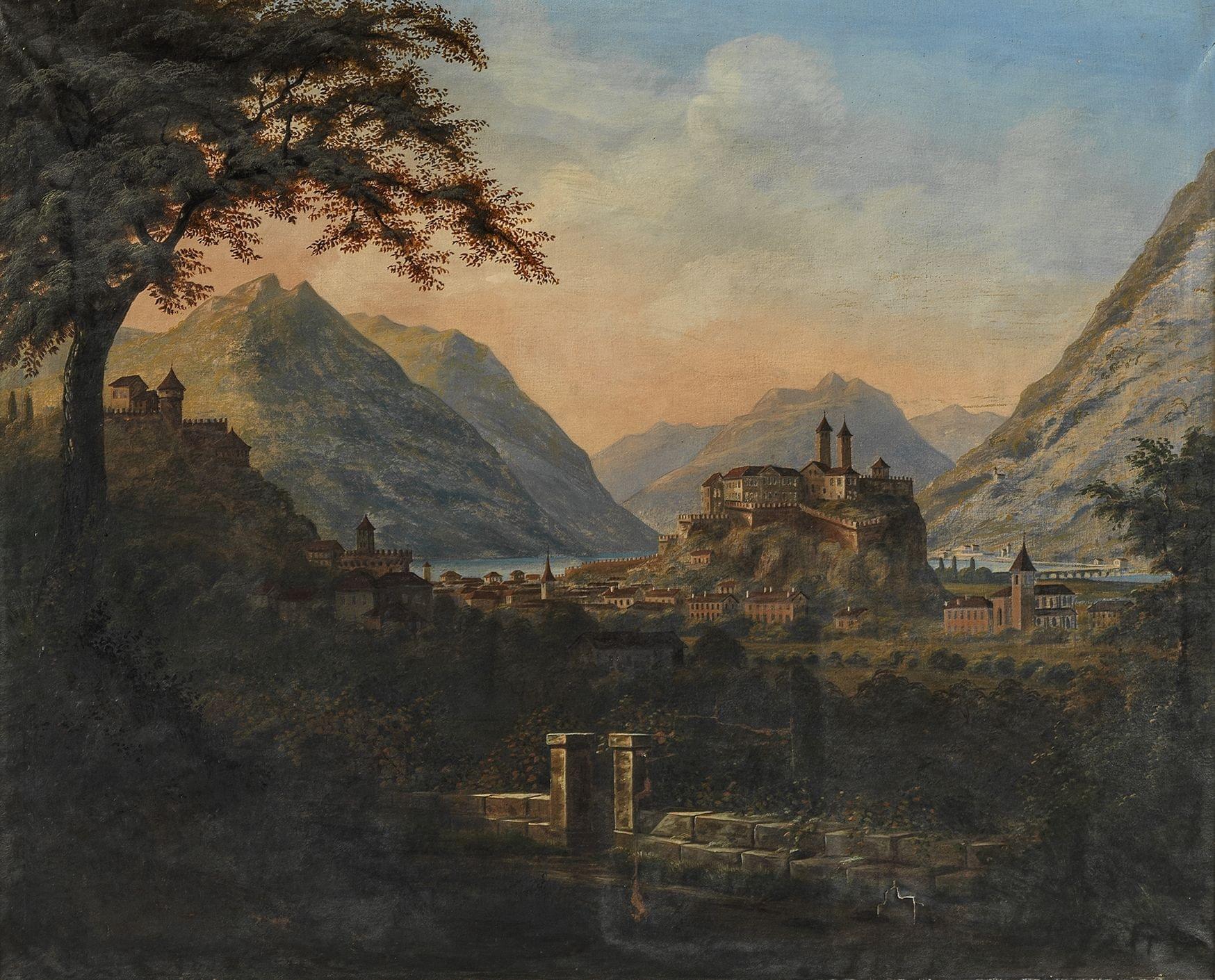 Ville de Bellinzona au Tessin, huile sur toile, 84x104 cm