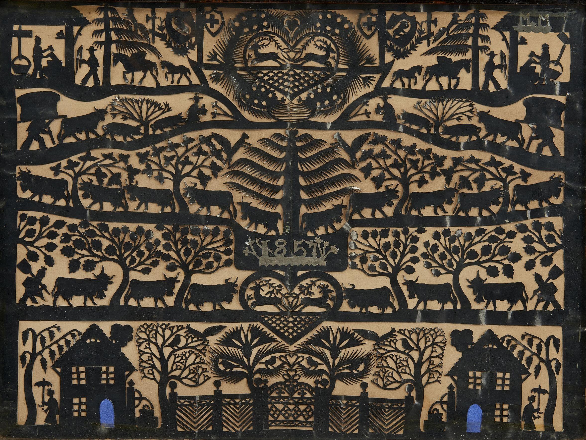 Poya, maisonnettes, vaches et scènes paysannes, découpage, daté 1857, 24x32 cm.