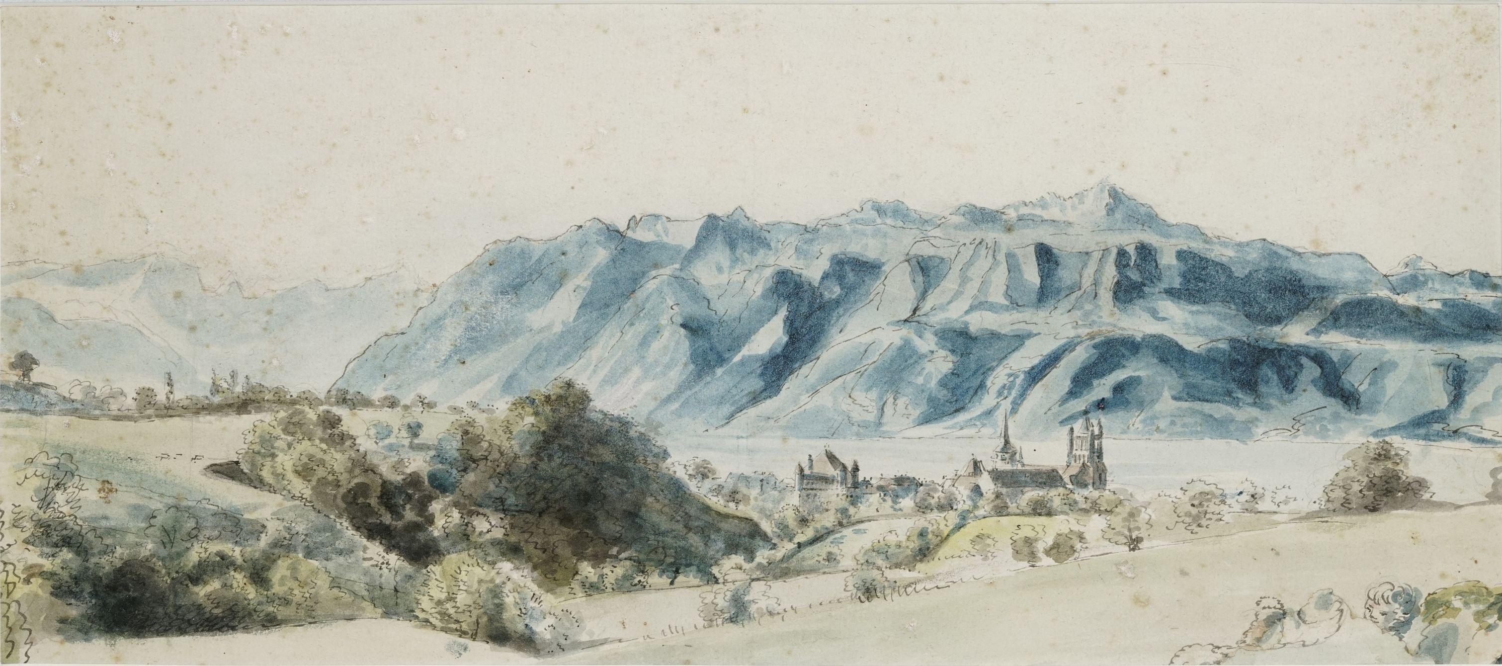 Vue de Lausanne et du Gramont, plume et aquarelle sur papier, 15x35cm. Cadre en bois sculpté et doré XVIIIe s