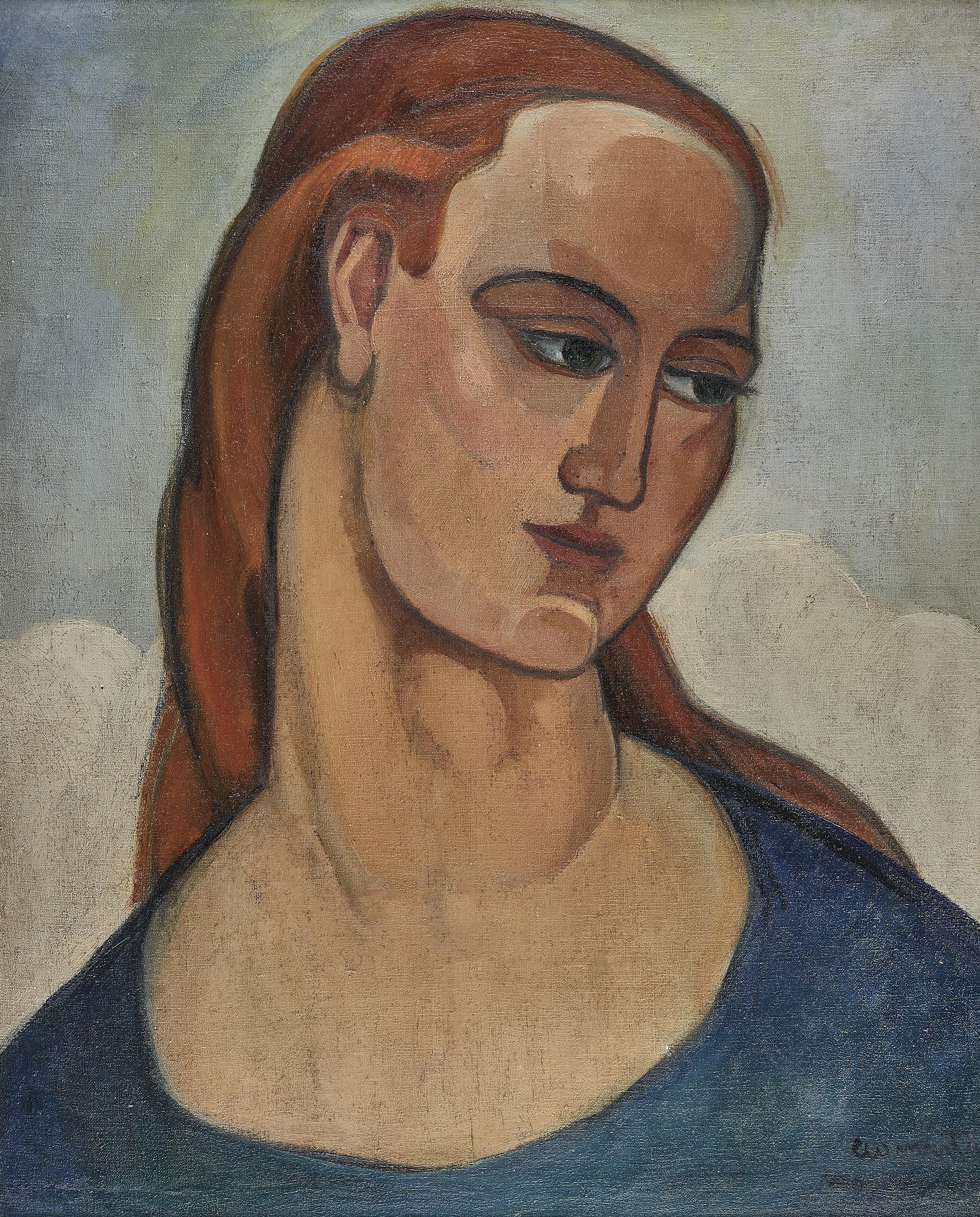 Portrait de femme, huile sur toile marouflée sur pavatex, signature illisible, 62x50 cm