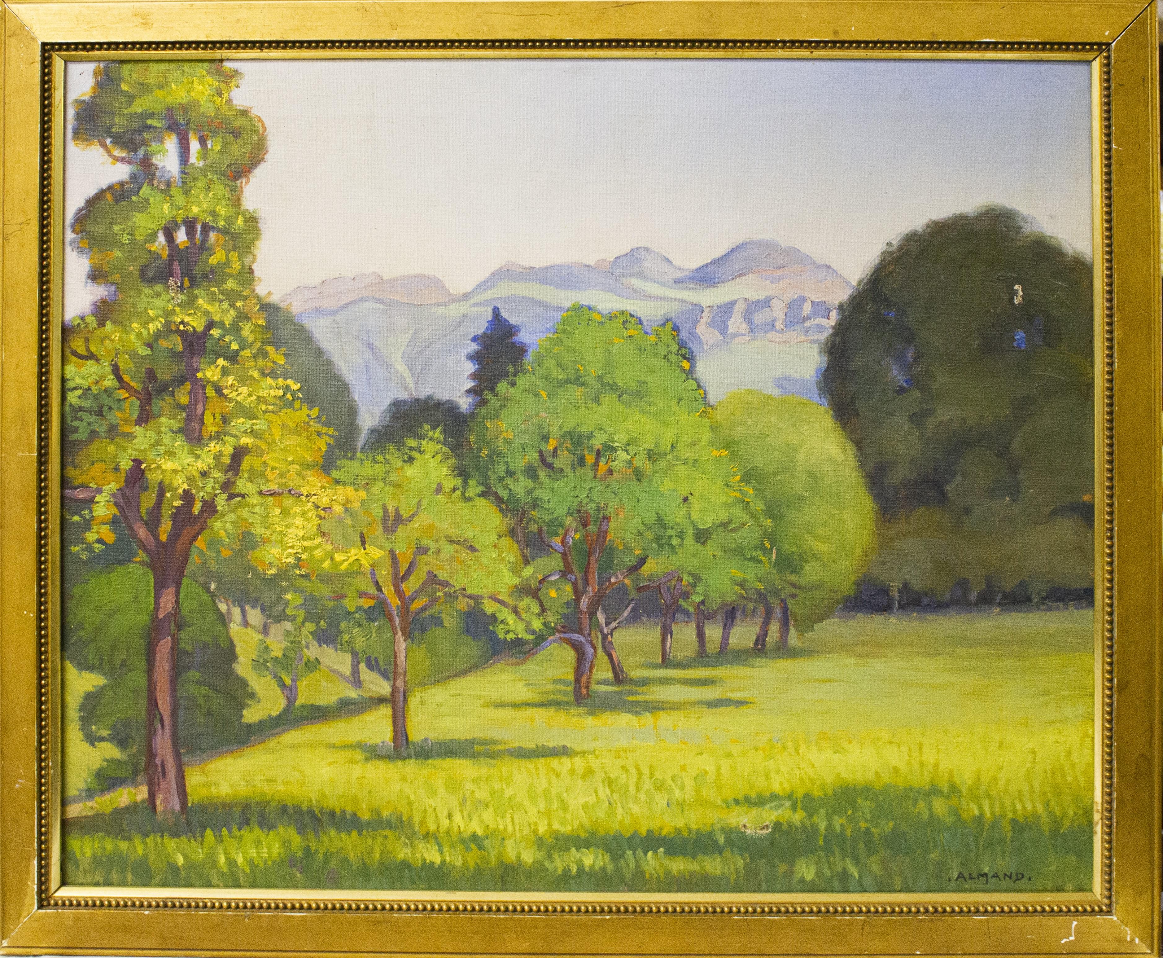 Paysage avec montagnes, huile sur toile, signée Almand, 45x60 cm