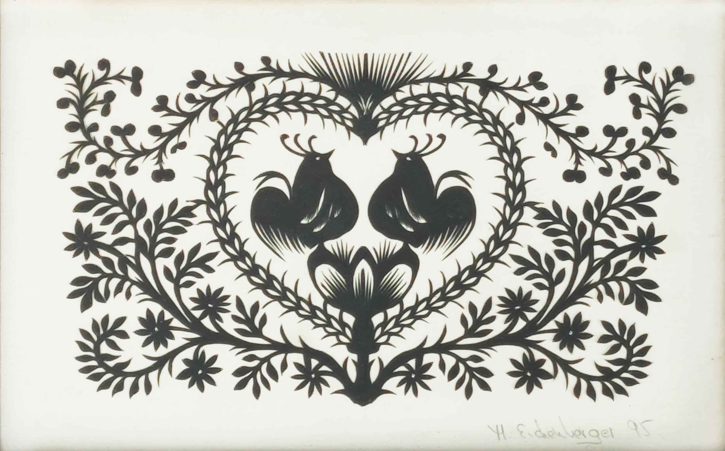 Découpage à motif d'un cœur, signée H.Eidenberger et datée 95, 9x14 cm