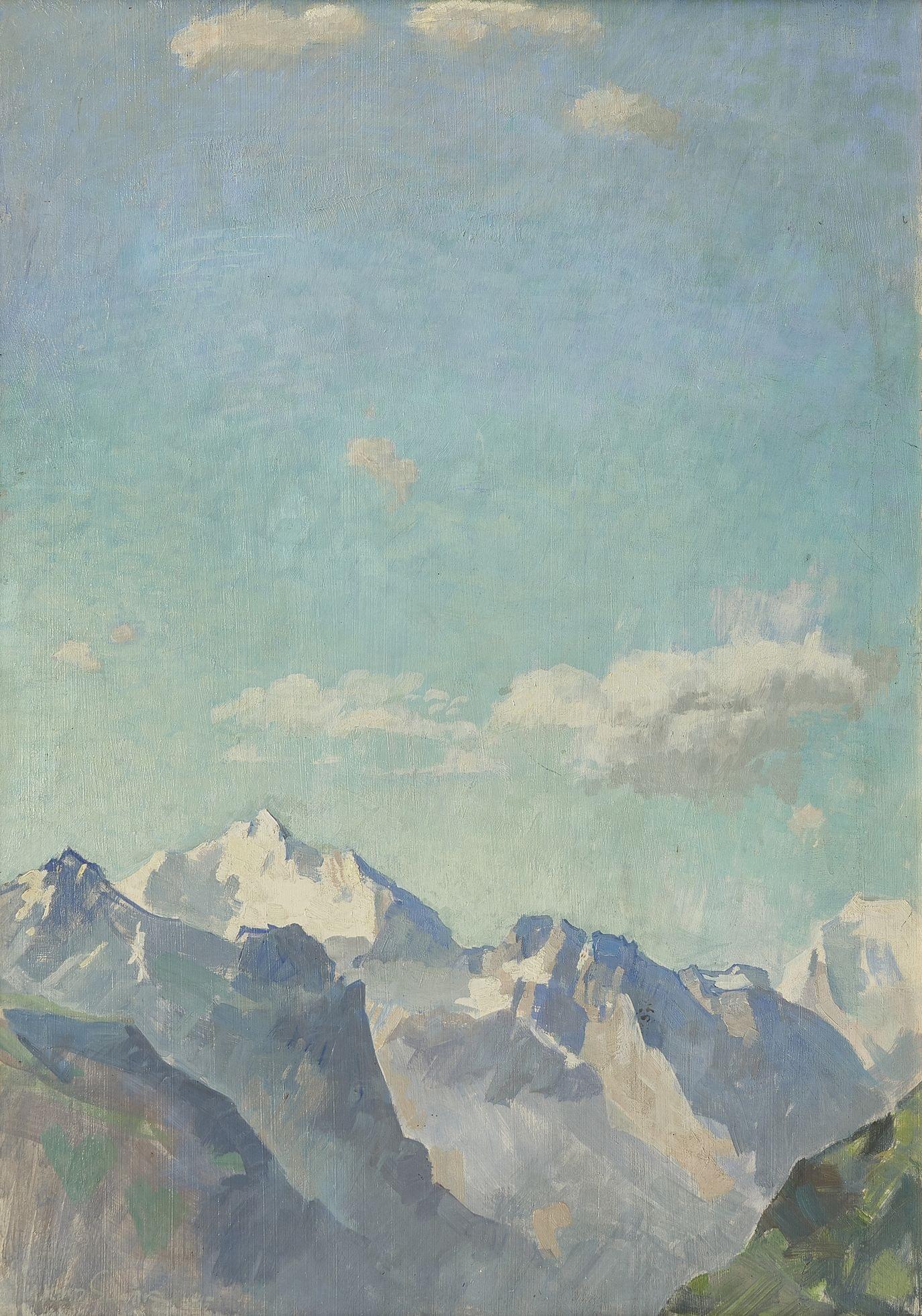 Paysage avec montagnes, huile sur pavatex, signature illisible, 69x48 cm
