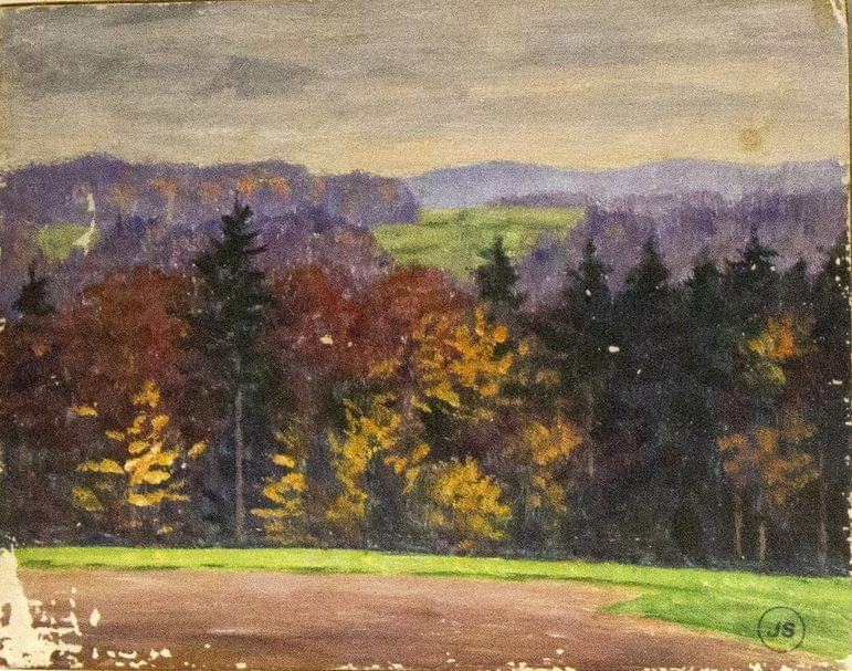 Ensemble de 25 paysages, huile et crayon gras sur papier marouflé sur pavatex, dont plusieurs monogrammés JS, 15x15 à 35x25 cm
