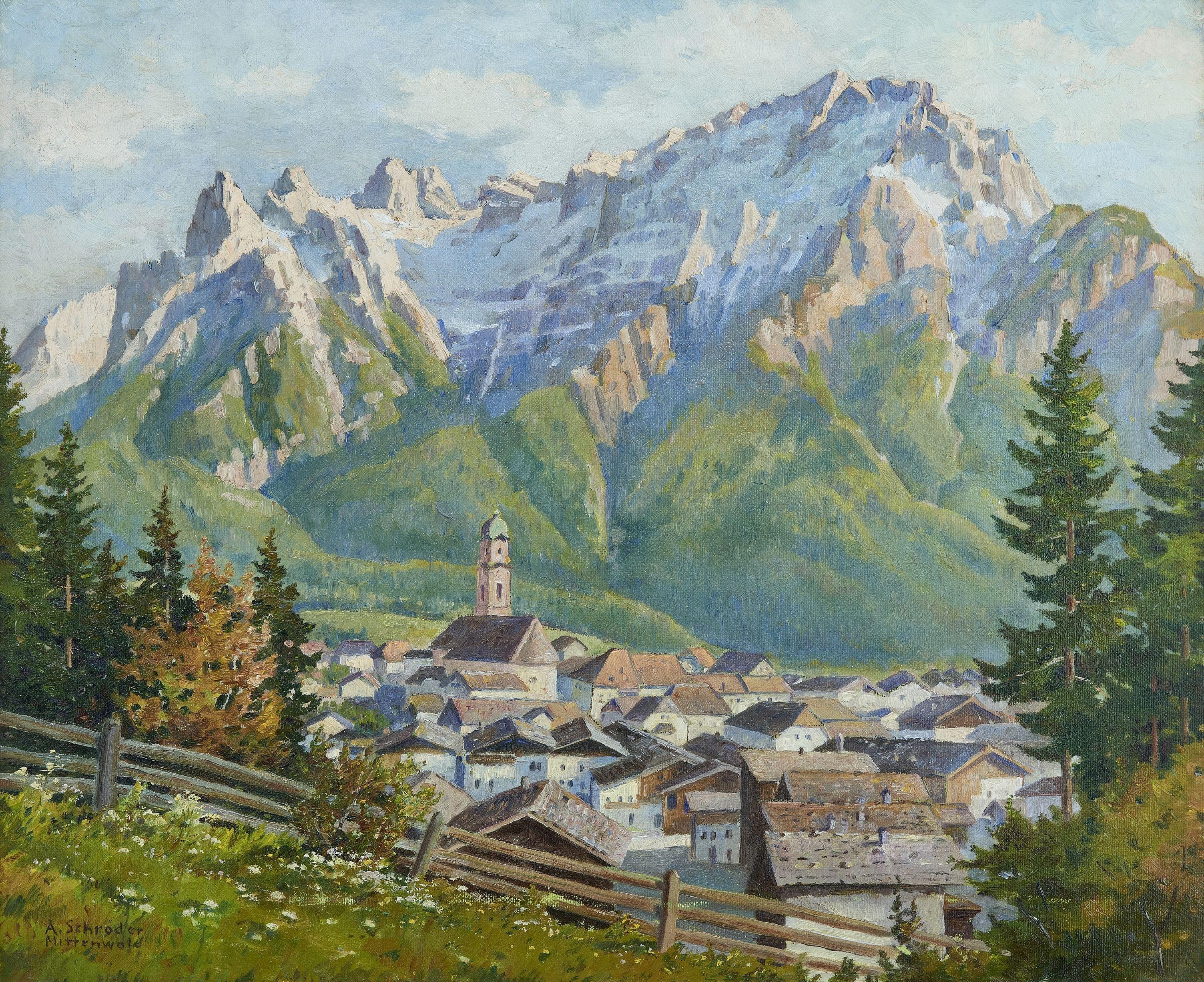 Mittenwald, huile sur pavatex, signée A. Schroder, 50x60 cm