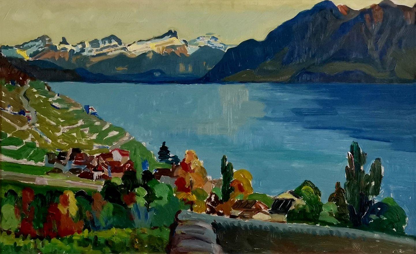Vue du lac, huile sur carton signée, 36x60 cm