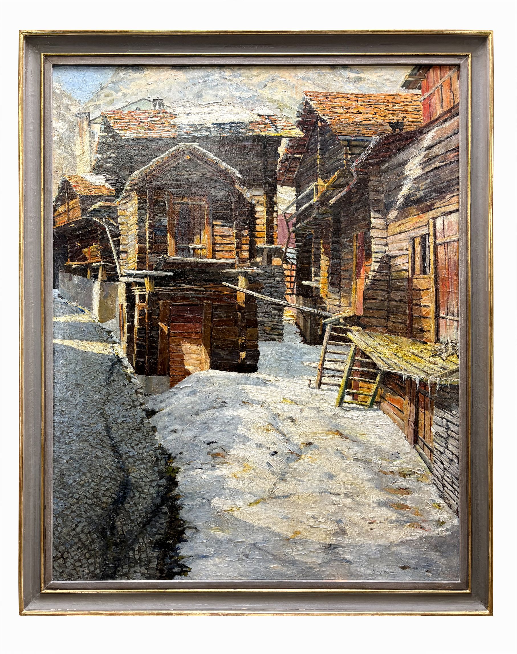 Hinterdorfstrasse en hiver, Zermatt, huile sur toile, signée, 122x97 cm