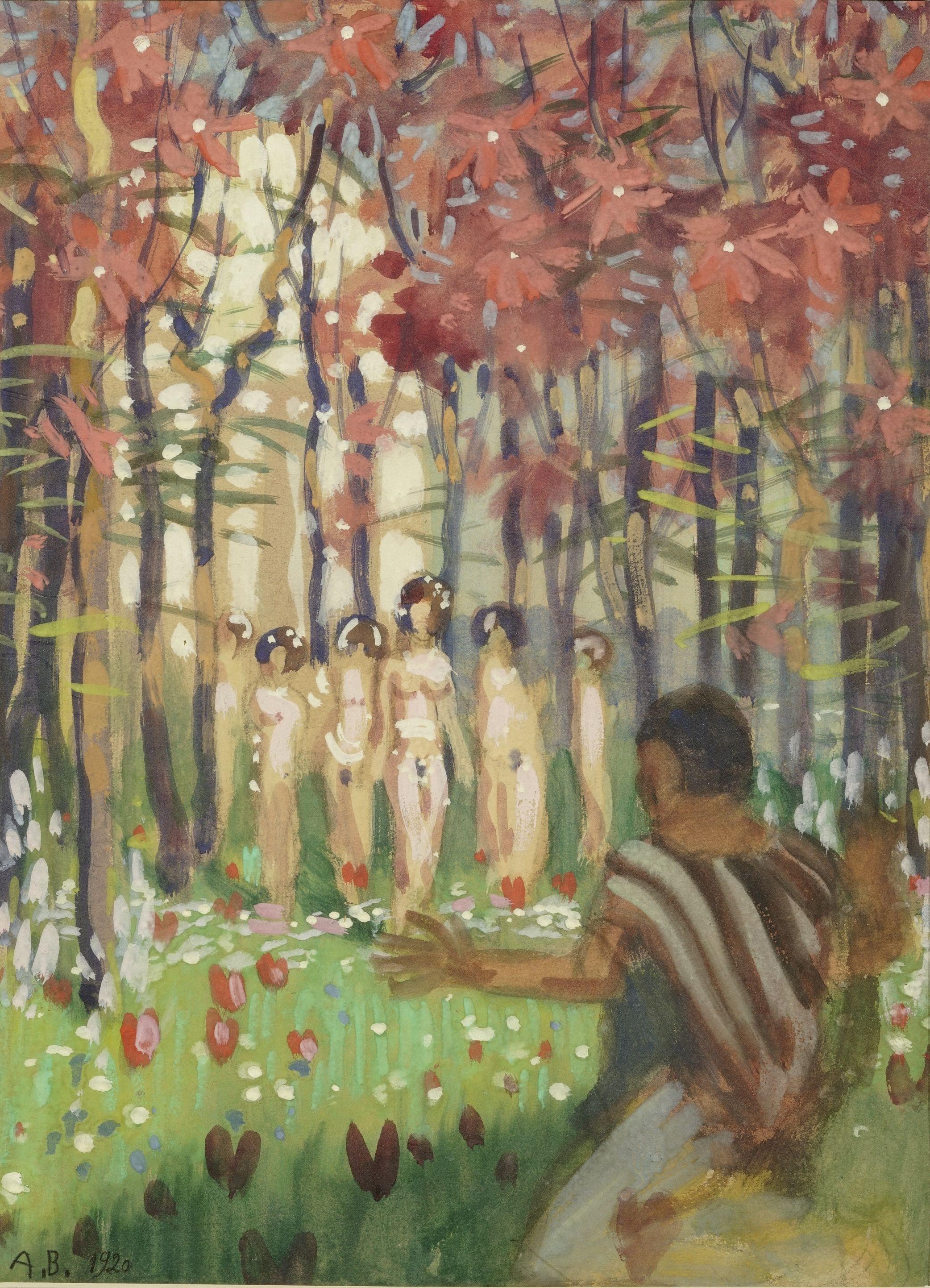 Silhouettes dans un sous-bois, gouache sur papier, monogrammée AB et datée 1920, 43x36 cm