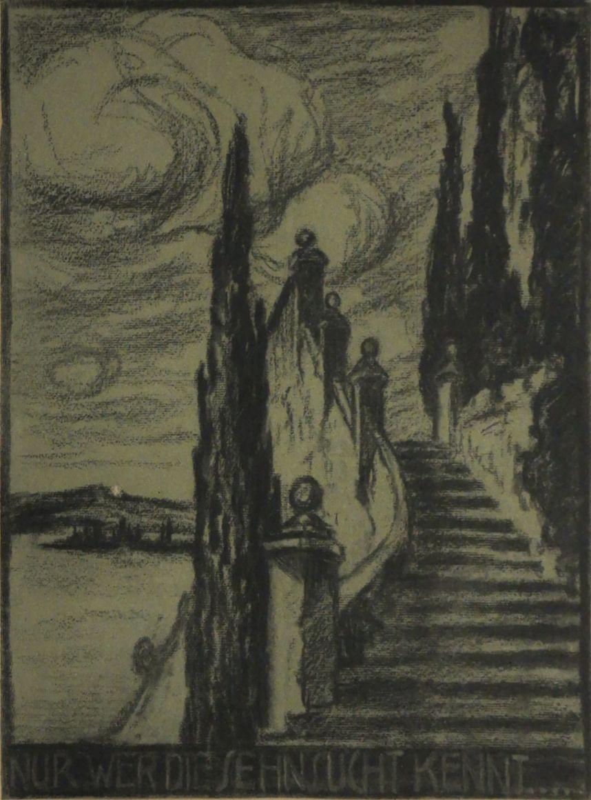 Nur Wer die Sehnsucht kennt, fusain sur papier, signé à la mine de plomb et daté 1922, 48x41 cm