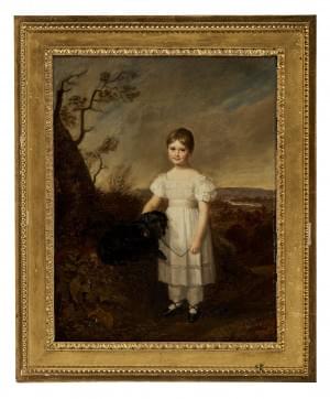 Portrait d'un petit enfant avec son chien, huile sur toile, 40x3...