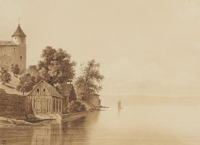 hâteau près du lac, lavis monogrammé AH, 16x22m. Provenance: c...